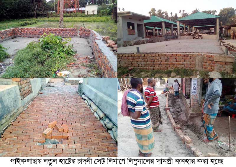 জানাগেছে, নতুন হাটের চাদনী সেট নির্মাণের জন্য ৫৭ লাক্ষ টাকা বরাদ্দ করা হয়েছে। ৬টি টিনসেট, ১টি খোলা চাদনী, ১টি ল্যাটিন, ১টি অফিস ঘর, ১টি টিউবওয়েল ও হাটের মধ্যে সিসিরোড নির্মাণ বাবদ এই অর্থ বরাদ্দ করা হয়েছে। ঠিকাদার বদুরুজ্জামান বাবলু এর মেসার্স ফয়সাল ট্রেডার্স ঠিকাদারী প্রতিষ্ঠান নির্মাণ কাজ করছে। কাজের শুরু থেকে নিম্নমানের সামগ্রী ব্যবহার করায় ব্যবসায়ীরা অভিযোগ করলেও ঠিকাদারী প্রতিষ্ঠান তা কর্ণপাত না করেই কাজ করে চলেছে। বাজারে কাঁচামাল ব্যবসায়ী কবির হোসেন জানান, ২/৩ নম্বর ইট দিয়ে কাজ করা হচ্ছে। সেটের মাঝখানে সিসিরোড এবড়ো থেবড়ো করে নির্মাণ করা হয়েছে। বৃষ্টি হলে পানি সেটের মধ্যে জমে থাকে বলে ব্যবসায়ী মোস্তফা, জয়নাল, বাবলু ও এরশাদ আলী জানিয়েছে। তারা আরো জানায়, সিডিউল মোতাবেক কাজ করার কথা বললে ঠিকাদারের লোকজন তাদের ধমক দিয়ে তাদের ইচ্ছামত কাজ চলেছে। বাজারে বৃষ্টির পানি নিষ্কাসনের পথ সঠিকভাবে রাখা হয়নি। সামান্য বৃষ্টি হলে পানি জমে থাকে। নির্মাণ কাজের সিডিউল সাইন বোর্ড বাজারে লাগানোর কথা থাকলেও তা লাগানো হয়নি। এ ব্যাপারে সাব কন্টাক্টর মোঃ আসলাম মিয়া বলেন, ঠিকাদার যে মালামাল দিচ্ছে তা দিয়ে আমরা কাজ করছি। নির্মাণ কাজের তদারকি করছেন ঠিকাদারের ভাই লাভলু। তার কাছে জানতে চাইলে তিনি রাগান্বিত হয়ে বলেন, সঠিক ভাবে কাজ করা হচ্ছে, বাজারের সকল ব্যবসায়ী আমার পক্ষে রয়েছে। তারাও আমার কাজে সহযোগিতা করছে। ২/৩ নম্বর ইট ব্যবহারের কথা জানতে চাইলে তিনি বলেন পাইকগাছা ভাটায় যে ইট পাওয়া যাচ্ছে সেই ইট দিয়ে কাজ করছি। ১/২ ইঞ্চি পরিমাণ বালু দিয়ে কাজ করায় সে কাজ বন্ধের বিষয় তিনি জানান, সিডিউলে ৬ ইঞ্চি পরিমাণ বালি দেওয়ার কথা থাকলেও এখন ১৮ থেকে ২০ ইঞ্চি পরিমাণে বালি দিয়ে কাজ করা হচ্ছে।