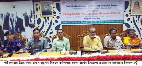 পাইকগাছায় উত্তম মৎস্য চাষ ব্যবস্থাপনা বিষয়ক কর্মশালা অনুষ্ঠিত হয়েছে। সাসটেনেবল কোস্টাল এন্ড মেরিন ফিশারিজ প্রকল্পের আওতায় মঙ্গলবার দুপুরে উপজেলা পরিষদ মিলনায়তনে সিনিয়র উপজেলা মৎস্য কর্মকর্তার কার্যালয় এ কর্মশালার আয়োজন করে। সিনিয়র উপজেলা মৎস্য কর্মকর্তা সৈকত মল্লিক এর সভাপতিত্বে কর্মশালায় প্রধান অতিথি ছিলেন, উপজেলা চেয়ারম্যান আনোয়ার ইকবাল মন্টু। বিশেষ অতিথি ছিলেন, উপজেলা প্রাণিসম্পদ কর্মকর্তা ডাঃ বিষ্ণুপদ বিশ্বাস, কৃষি অফিসার কৃষিবিদ অসিম কুমার দাস, ওসি (তদন্ত) রঞ্জন কুমার গাইন, উপজেলা যুব উন্নয়ন কর্মকর্তা পারভীন আক্তার বানু, সমবায় কর্মকর্তা হুমায়ূন কবির, নৌ-পুলিশের এসআই জাহিদ হোসেন, মেরিন ফিশারিজ কর্মকর্তা কাওসার হোসেন আকন, এসডিএফ কর্মকর্তা নাসিম আনসারী। বক্তব্য রাখেন, মৎস্য আড়ৎদারী সমবায় সমিতির সভাপতি জাকির হোসেন, সাধারণ সম্পাদক ওবায়দুল হক মিঠু ও সন্তোষ কুমার সরদার। কর্মশালায় পুকুর ও ঘের তৈরী থেকে শুরু করে পোনা মজুদ, চাষাবাদ এবং বাজারজাত পর্যায়ে নিরাপদ ও ভালো ব্যবস্থাপনার উপর গুরুতারোপ করা হয়।